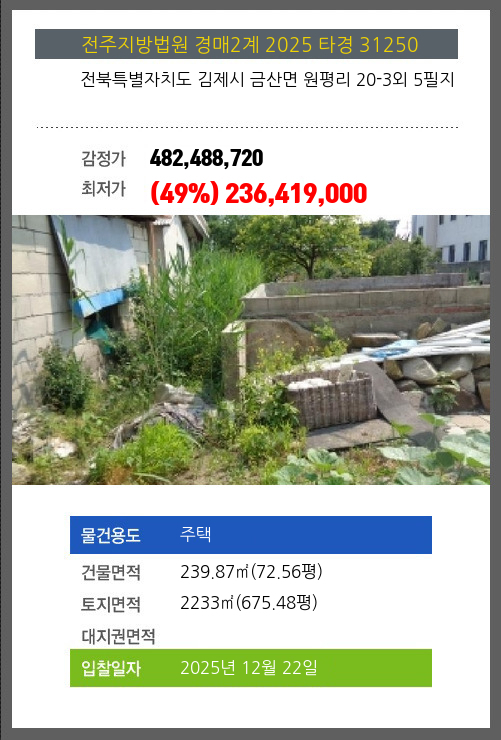 | 소재지 | [지번] 전북특별자치도 김제시 금산면 원평리 20-3외 5필지 [도로명 주소] 전라북도 김제시 금산면 원평로 82외 5필지 |