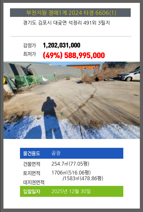 | 소재지 | [지번] 경기도 김포시 대곶면 석정리 491외 3필지 [도로명 주소] 경기도 김포시 대곶면 대곶로 277-10외 3필지 |