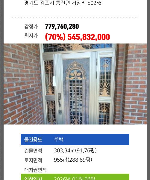 | 건물면적 | 254.7㎡ (77.05평) | 채무자 | 농** | 최저가 | (49%) 588,995,000 |