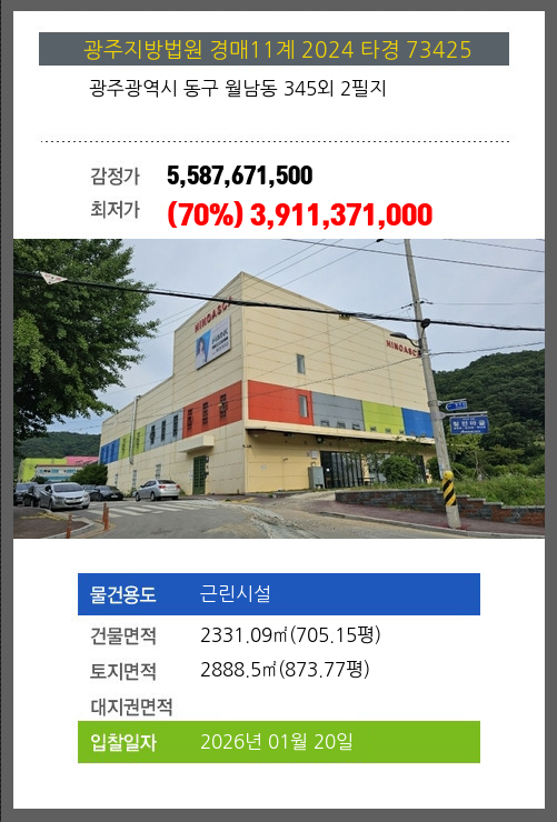 | 소재지 | [지번] 광주광역시 동구 월남동 345외 2필지 [도로명 주소] 광주광역시 동구 칠전길 2외 2필지 |