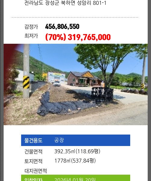 | 토지면적 | 2888.5㎡ (873.77평) | 소유자 | ㈜** | 보증금 | (10%) 391,137,100 |