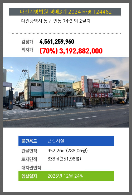 | 용도 | 근린시설 | 채권자 | 대**외1명 | 감정가 | 4,561,259,960 |