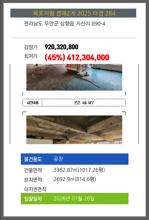 | 건물면적 | 3362.87㎡ (1017.26평) | 채무자 | 유** | 최저가 | (45%) 412,304,000 |
