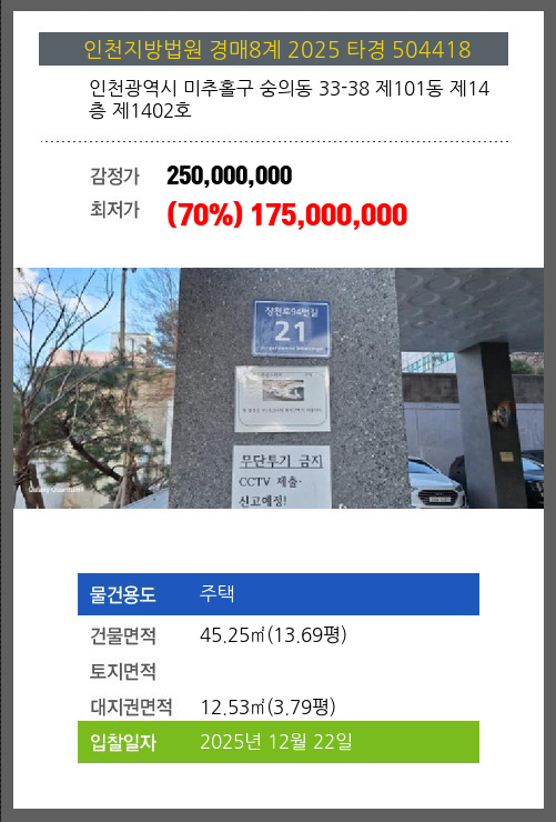| 건물면적 | 45.25㎡ (13.69평) | 채무자 | 박** | 최저가 | (70%) 175,000,000 |