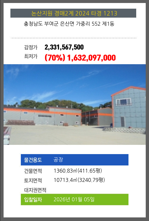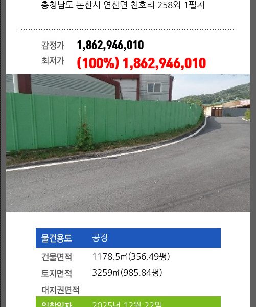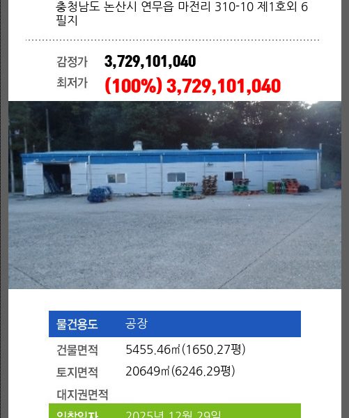 | 용도 | 공장 | 채권자 | ㈜**외1명 | 감정가 | 2,331,567,500 |