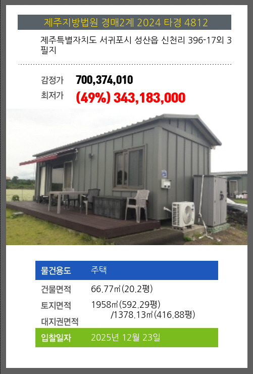 | 소재지 | [지번] 제주특별자치도 서귀포시 성산읍 신천리 396-17외 3필지 [도로명 주소] 제주특별자치도 서귀포시 성산읍 신천서로50번길 8-6외 3필지 |