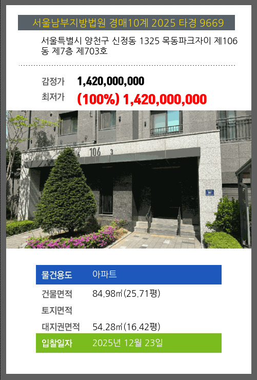 | 건물면적 | 84.98㎡ (25.71평) | 채무자 | 이** | 최저가 | (100%) 1,420,000,000 |