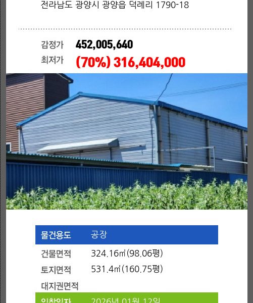 | 건물면적 | 325.4㎡ (98.43평) | 채무자 | 김** | 최저가 | (70%) 451,076,000 |