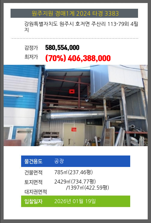 | 건물면적 | 785㎡ (237.46평) | 채무자 | 김** | 최저가 | (70%) 406,388,000 |