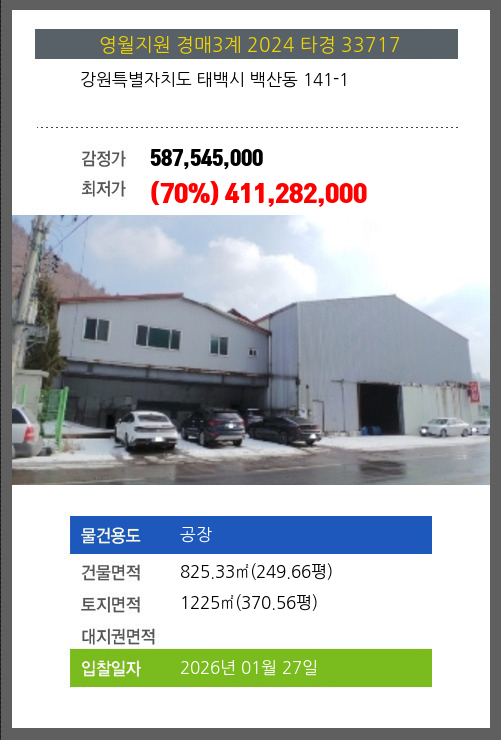 | 건물면적 | 825.33㎡ (249.66평) | 채무자 | 정** | 최저가 | (70%) 411,282,000 |