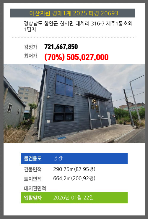 | 소재지 | [지번] 경상남도 함안군 칠서면 대치리 316-7 제주1동호외 1필지 [도로명 주소] 경상남도 함안군 칠서면 공단상가2길 9 제주1동호외 1필지 |