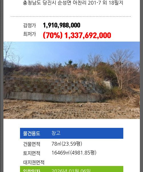 | 토지면적 | 6094㎡ (1843.43평) | 소유자 | ㈜** | 보증금 | (10%) 173,701,864 |