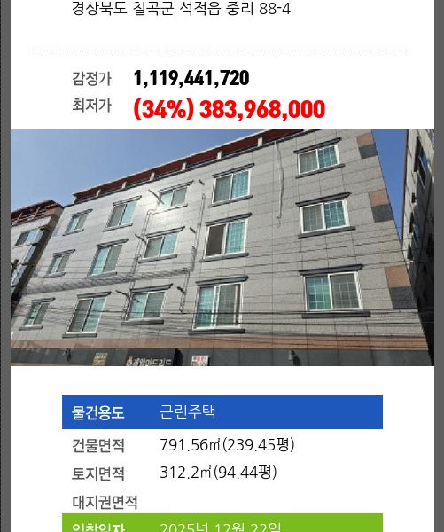 | 건물면적 | 2837.88㎡ (858.45평) | 채무자 | 김** | 최저가 | (100%) 1,913,384,390 |