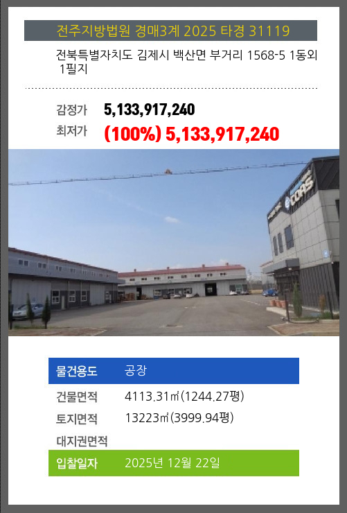 | 소재지 | [지번] 전북특별자치도 김제시 백산면 부거리 1568-5 1동외 1필지 [도로명 주소] 전라북도 김제시 백산면 지평선산단5길 129 1동외 1필지 |