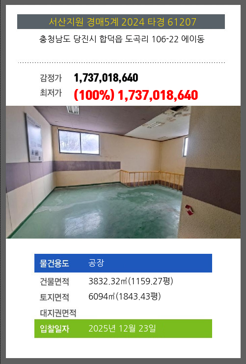 | 토지면적 | 6094㎡ (1843.43평) | 소유자 | ㈜** | 보증금 | (10%) 173,701,864 |