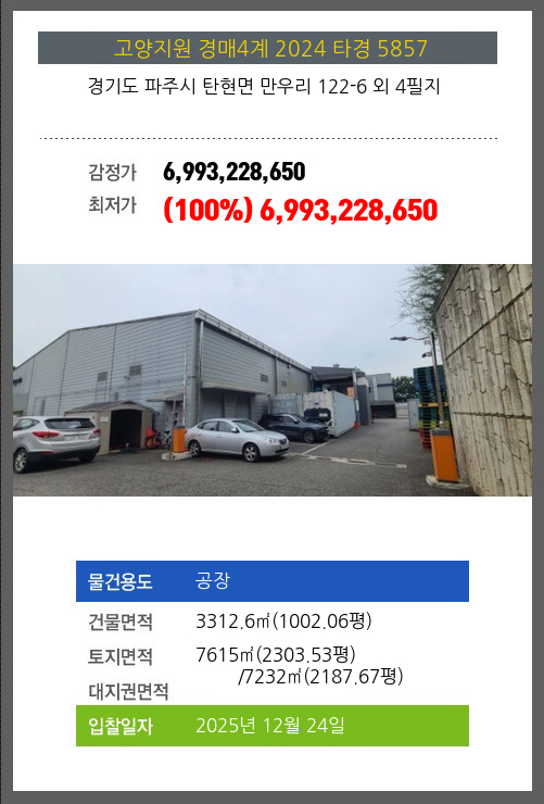 | 용도 | 공장 | 채권자 | ㈜** | 감정가 | 6,993,228,650 |