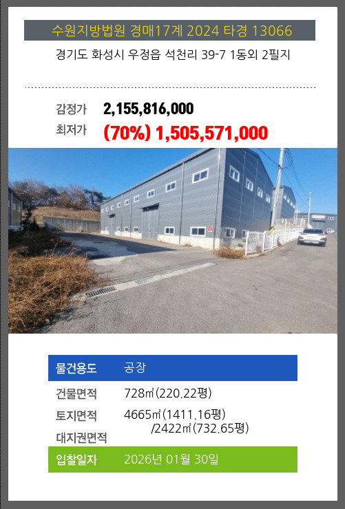 화성공장경매 화성시 우정읍 석천리 39-7 1동외 2필지 №2024 타경 13066