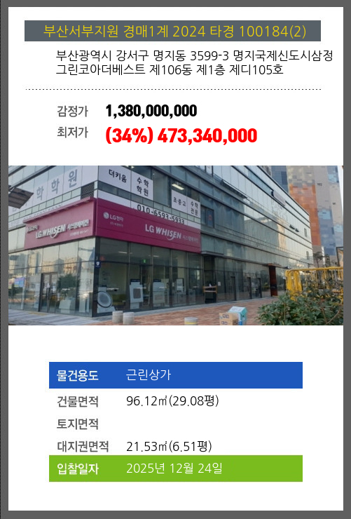 본건은 부산광역시 강서구 명지동 3599-3 명지국제신도시삼정그린코아더베스트 제106동 제1층 제디105호