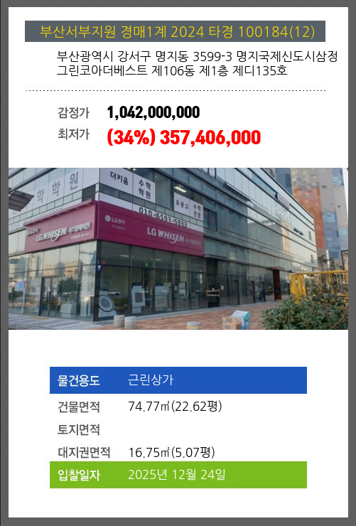 본건은 부산광역시 강서구 명지동 3599-3 명지국제신도시삼정그린코아더베스트 제106동 제1층 제디135호