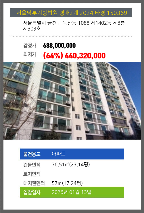 금천아파트경매 금천구 독산동 1088 제1402동 제3층 제303호 №2024 타경 150369