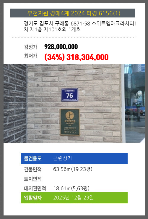 본건은 경기도 김포시 구래동 6871-58 스위트엠아크라시티1차 제1층 제101호외 1개호