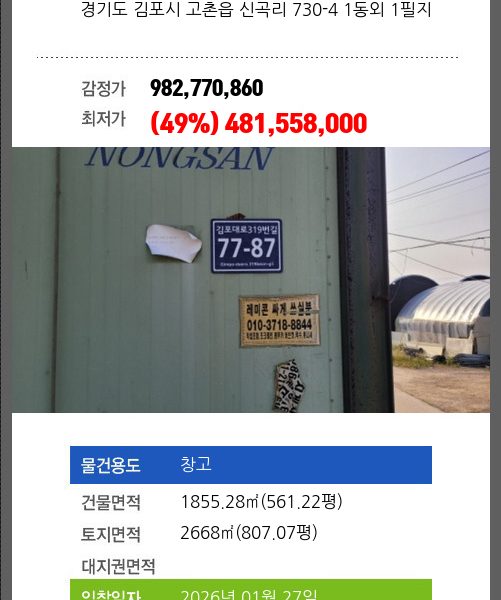 | 건물면적 | 63.56㎡ (19.23평) | 채무자 | ㈜** | 최저가 | (34%) 318,304,000 |