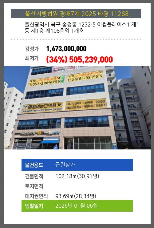 본건은 울산광역시 북구 송정동 1232-5 어썸플레이스1 제1동 제1층 제108호외 1개호