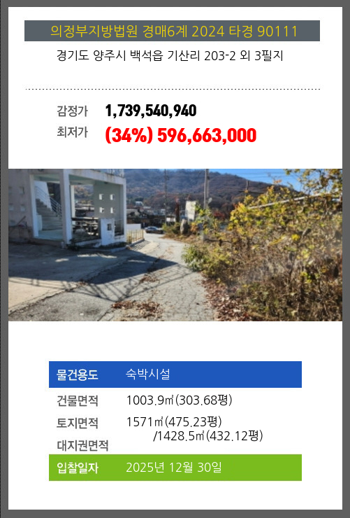 | 소재지 | [지번] 경기도 양주시 백석읍 기산리 203-2 외 3필지 [도로명 주소] 경기 양주시 백석읍 권율로 894외 3필지 |