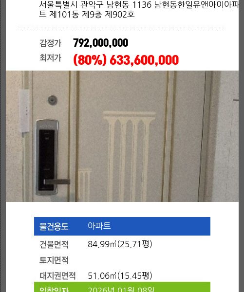 | 최초경매일 | 2026-01-06 | 배당종기일 | 2025-01-31 | 경매개시일 | 2024-11-20 |