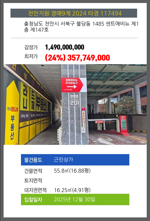 천안상가경매 천안시 서북구 불당동 1485 센트애비뉴 제1층 제147호 №2024 타경 117494