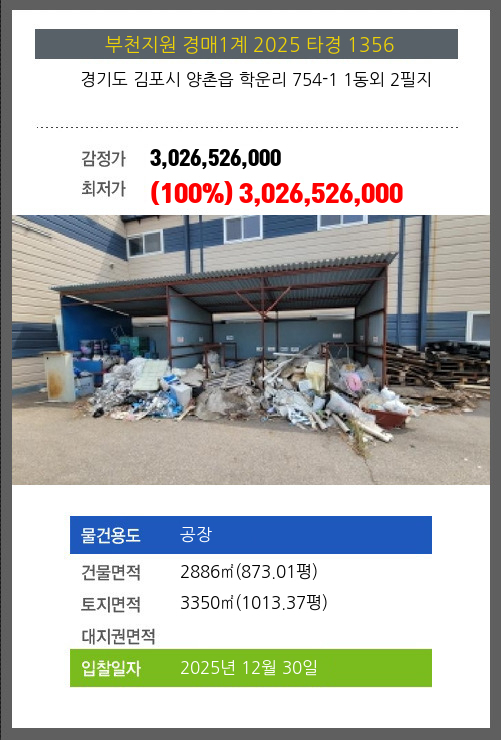 | 건물면적 | 2886㎡ (873.01평) | 채무자 | 허**외1명 | 최저가 | (100%) 3,026,526,000 |