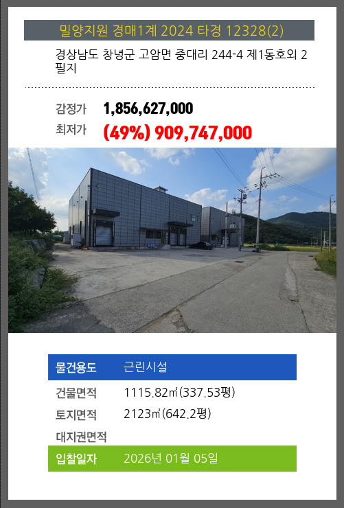 | 건물면적 | 1115.82㎡ (337.53평) | 채무자 | 농** | 최저가 | (49%) 909,747,000 |