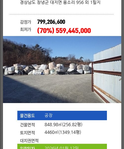| 소재지 | [지번] 경상남도 창녕군 고암면 중대리 244-4 제1동호외 2필지 [도로명 주소] 경상남도 창녕군 고암면 갈동길 15 제1동호외 2필지 |
