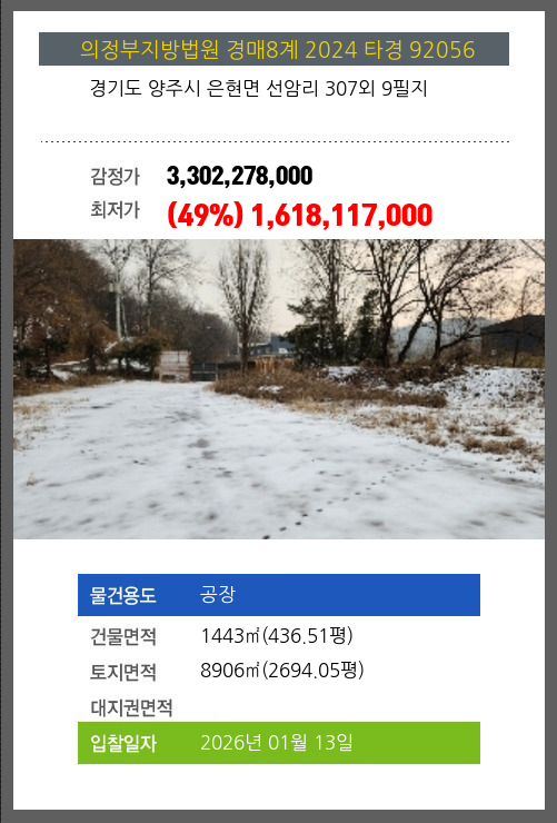 | 소재지 | [지번] 경기도 양주시 은현면 선암리 307외 9필지 [도로명 주소] 경기도 양주시 은현면 화합로863번길 34-75외 9필지 |