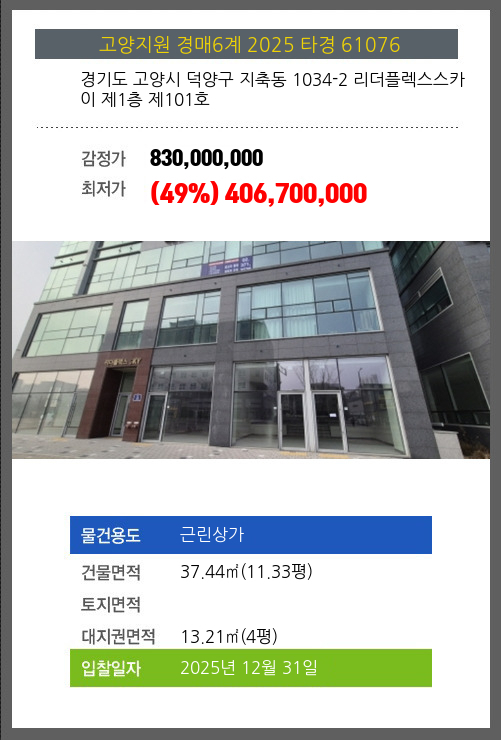 | 용도 | 근린상가 | 채권자 | 고** | 감정가 | 830,000,000 |