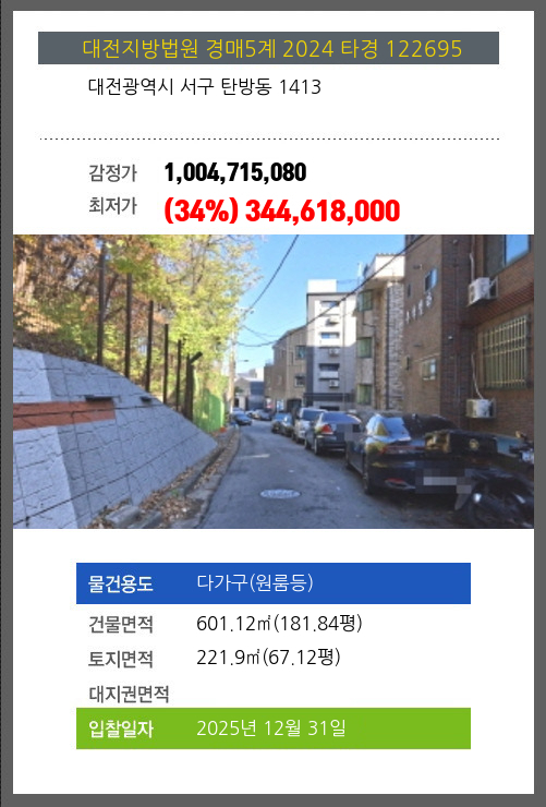 | 매각대상 | 공시가격3~4억 | 경매종류 | 강제경매 | 사건접수일 | 2024-11-15 |
