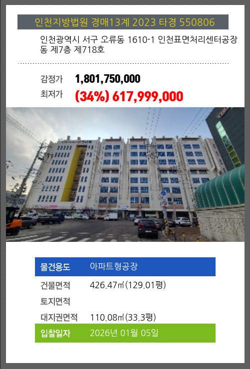 본건은 인천광역시 서구 오류동 1610-1 인천표면처리센터공장동 제7층 제718호