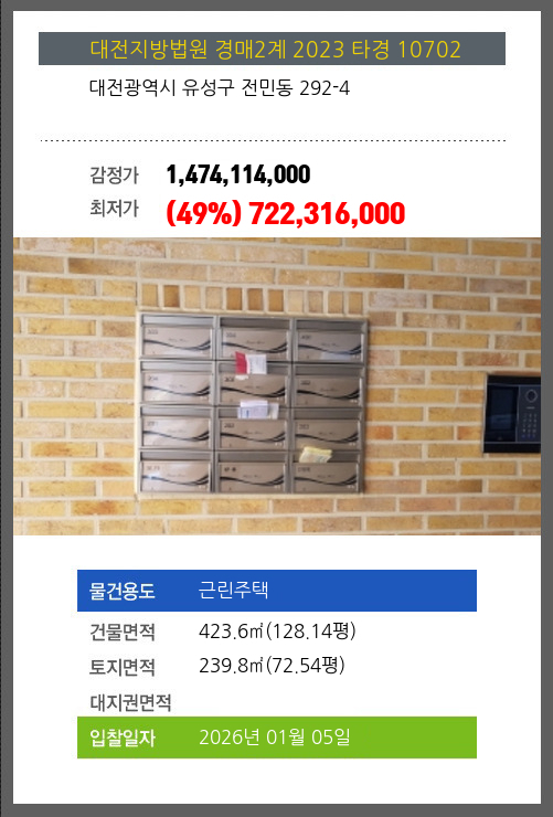 유성주택경매 유성구 전민동 292-4 №2023 타경 10702