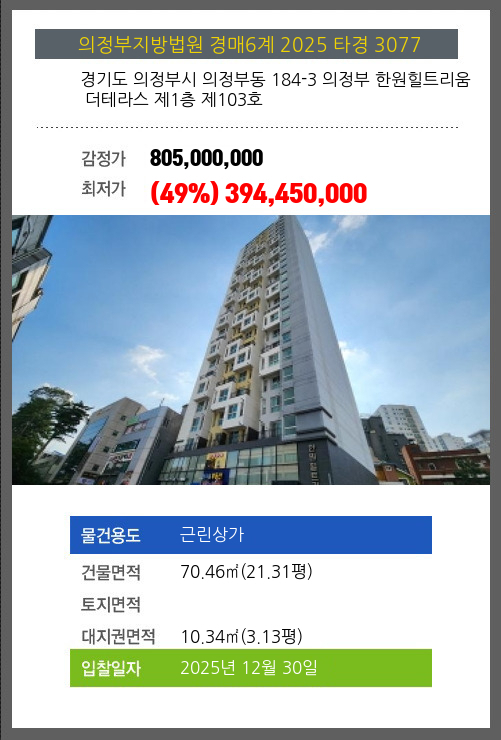 의정부상가경매 의정부시 의정부동 184-3 의정부 한원힐트리움 더테라스 제1층 제103호 №2025 타경 3077