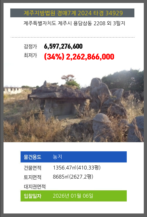 | 소재지 | [지번] 제주특별자치도 제주시 용담삼동 2208 외 3필지 | ||||