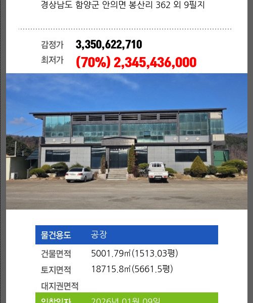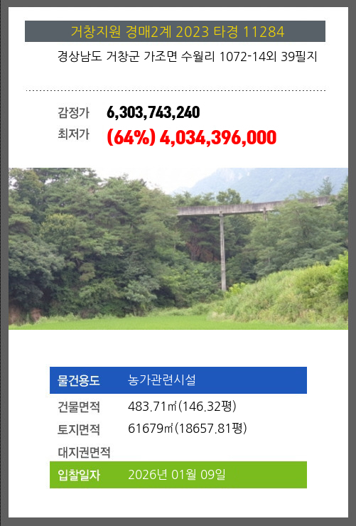 | 용도 | 농가관련시설 | 채권자 | 북** | 감정가 | 6,303,743,240 |