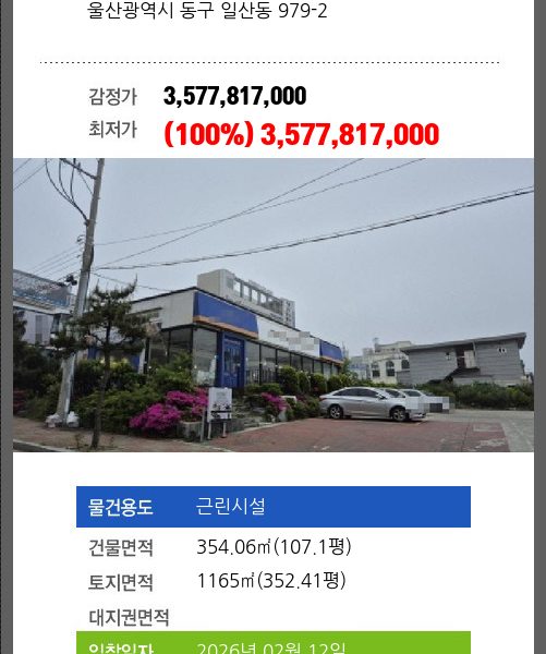| 용도 | 근린시설 | 채권자 | ㈜** | 감정가 | 3,419,622,000 |