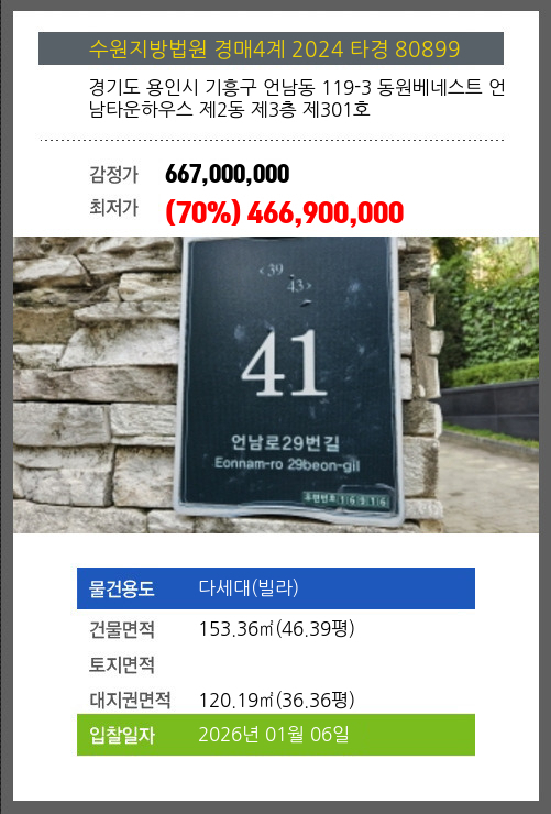 | 대지권 | 120.19㎡ (36.36평) | 소유자 | 오** | 보증금 | (10%) 46,690,000 |