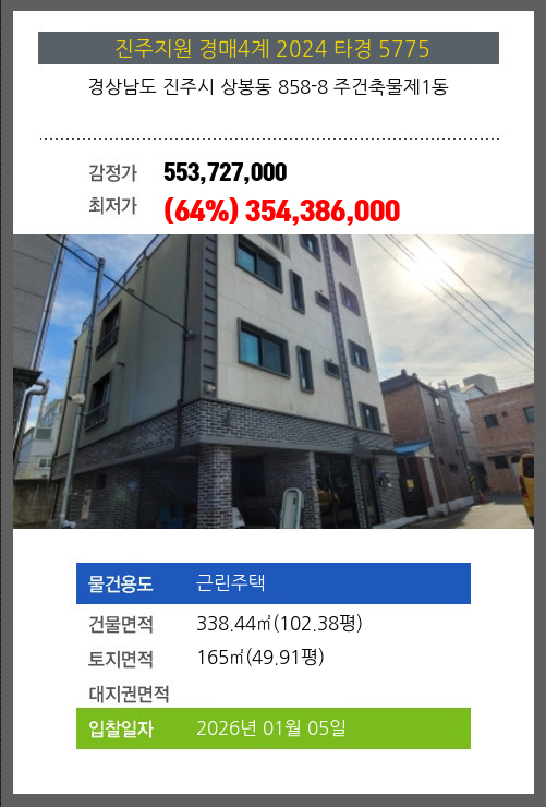 | 용도 | 근린주택 | 채권자 | 최** | 감정가 | 553,727,000 |