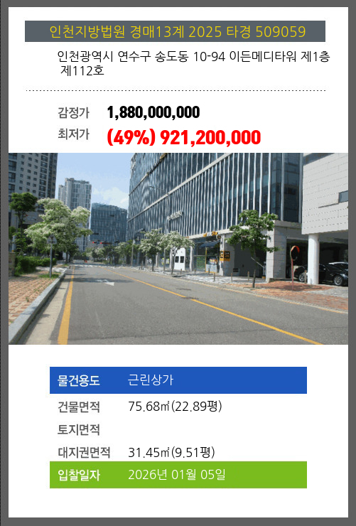 본건은 인천광역시 연수구 송도동 10-94 이든메디타워 제1층 제112호
