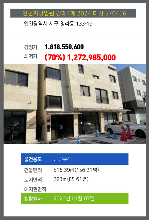 | 용도 | 근린주택 | 채권자 | 인** | 감정가 | 1,818,550,600 |