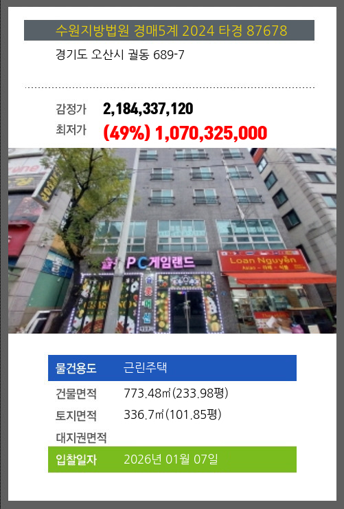 건물면적 773.48㎡ (233.98평) 채무자 성** 최저가 (49%) 1,070,325,000