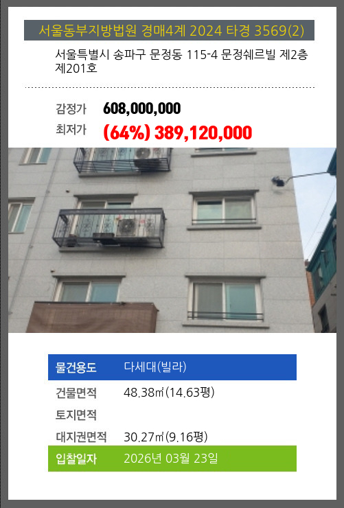 본건은 서울특별시 송파구 문정동 115-4 문정쉐르빌 제2층 제201호