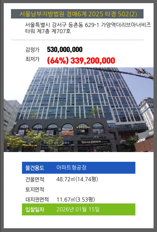 본건은 서울특별시 강서구 등촌동 629-1 가양역더리브아너비즈타워 제7층 제707호