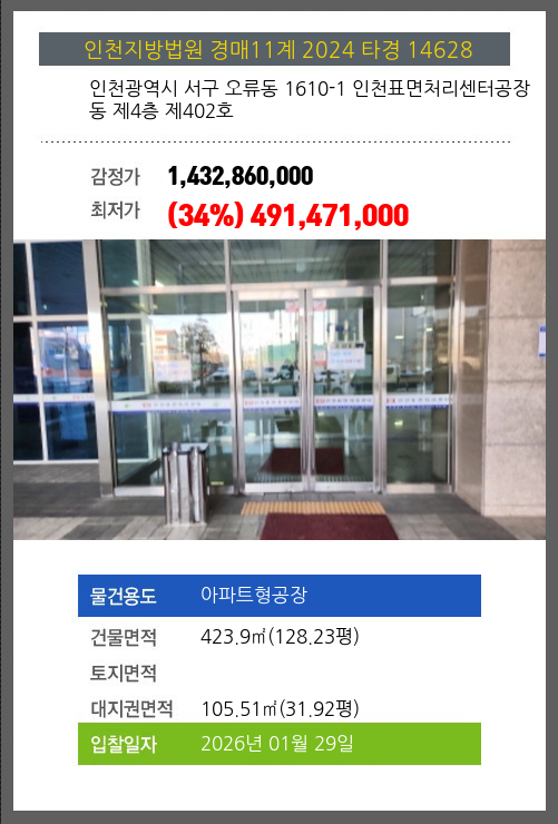 본건은 인천광역시 서구 오류동 1610-1 인천표면처리센터공장동 제4층 제402호